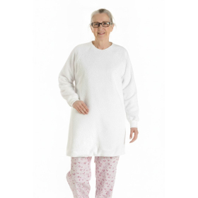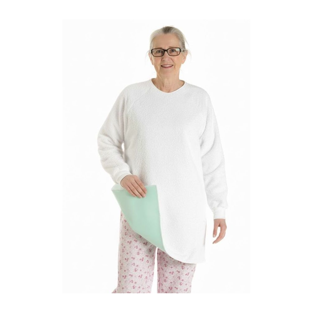 Bavoir avec manches pour une protection complète du haut de corps et des cuisses lors des repas.